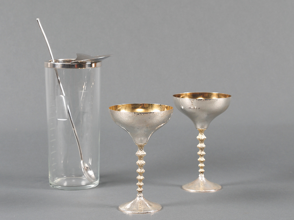 With cocktails currently being in fashion, Stephen Kalms Antiques has a wide selection of what is needed for the bartender at home, including a pair of silver cocktail goblets by Stuart Devlin (£1,775) and a very stylish 1940s Danish glass and silver mixer (£1,100).