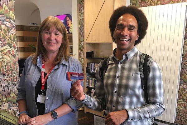 Image: Joseph Coelho is presented with his library card by Storyhouse library volunteer Jolyne Thomas