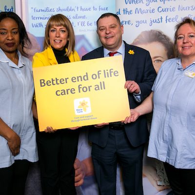 Weaver Vale MP Mike Amesbury with Cold Feet star Fay Ripley and Marie Curie nurses Victoria Shodeko and Victoria Oluwalogbon…