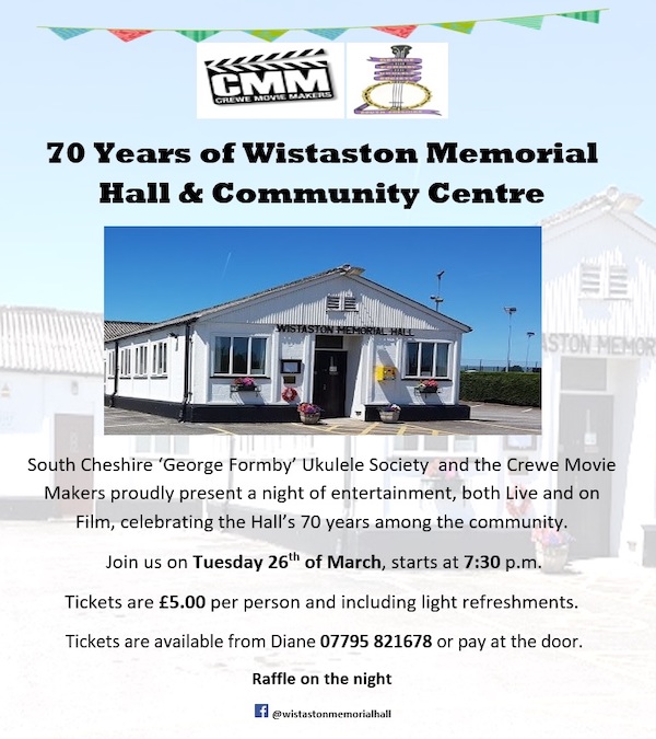 South Cheshire ‘George Formby’ Ukulele Society and the Crewe Movie Makers proudly present an event celebrating 70 years of Wistaston Memorial Hall & Community Centre on Tuesday 26th March 2019 (7.30pm start).