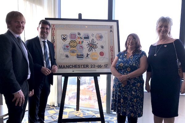Mr Burnham unveiled a tapestry designed and created by local artist Pauline Kirton, in the aftermath of the attack, which symbolises everything good about the way Manchester came together in solidarity following the attack.