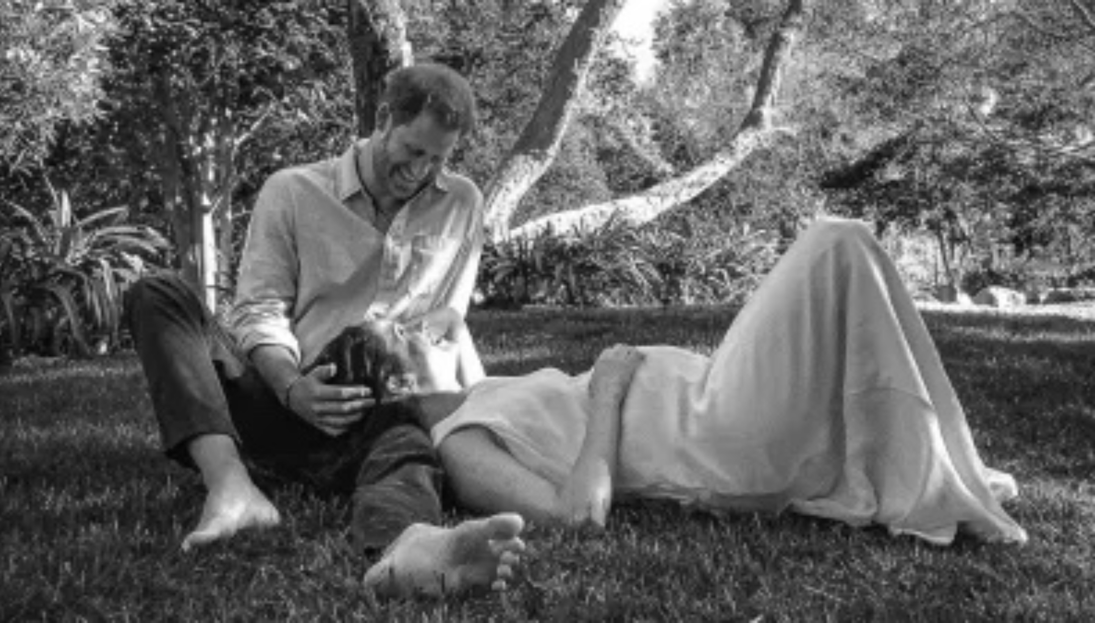 The couple shared a black and white picture of themselves underneath a tree, with Harry resting his hand on Meghan’s head as she cradles her bump.