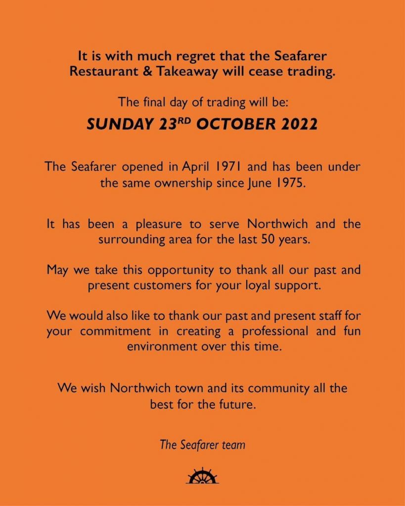 Announcing the news on Facebook, the owners of The Seafarer said: “It is with much regret that the Seafarer Restaurant & Takeaway will cease trading.”