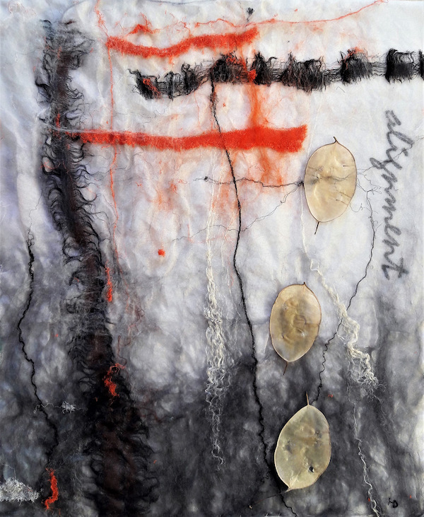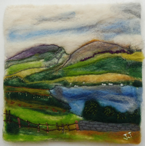 There are diaphanous hangings on transparent backgrounds, interpretations of waterfalls, landscapes including views of the Lake District in needlefelt, wet and nuno felt.
