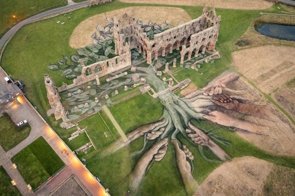 It makes use of Whitby Abbey’s vast landscape and natural pigments painted on the ground to show seven hands holding the roots of a tree.