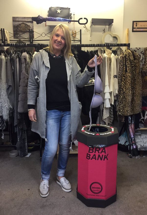 The scheme provides an eye-catching pink bra bank, where unwanted bras can be deposited before being recycled by the charity.