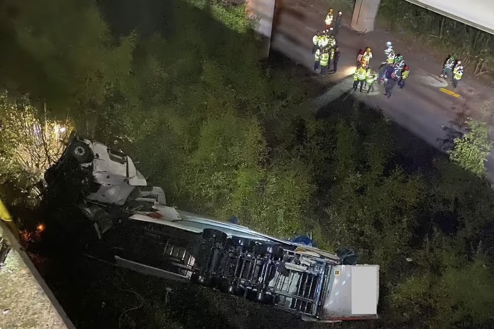 “On arrival, they found that a HGV had left the carriageway and overturned on an embankment, falling approximately 60m.