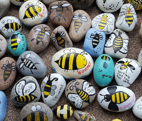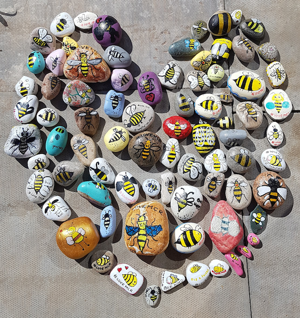 The ‘Love on the Rocks Wistaston, Crewe & Nantwich’ and ‘Love on the Rocks Shavington, Wybunbury and Hough’ pebbleart Facebook groups have been painting their own bee designs on rocks along with the hashtag #LoveMCRBees.