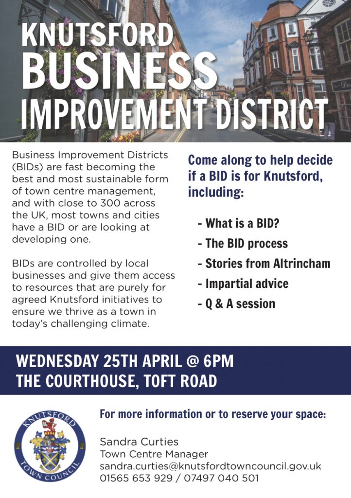 Knutsford’s town centre businesses are being invited to attend a meeting later this month to help decide if a Business Improvement District (BID) would be suitable for Knutsford.