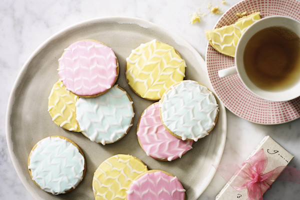 4. Spread 8 of the biscuits with blue icing. Pipe 5 lines of white icing at equal distances apart, then drag the tip of a cocktail stick across the white icing in alternate directions. Repeat with the pink and yellow icing on the remaining biscuits. Leave aside until the icing is set.