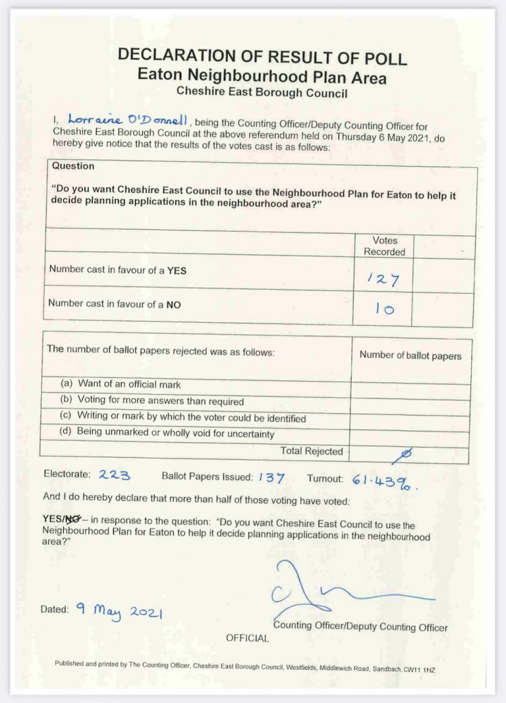 The residents of Alderley Edge, Eaton, Gawsworth, Hankelow, Peover Superior and Shavington-cum-Gresty have all voted to implement their respective neighbourhood plans.