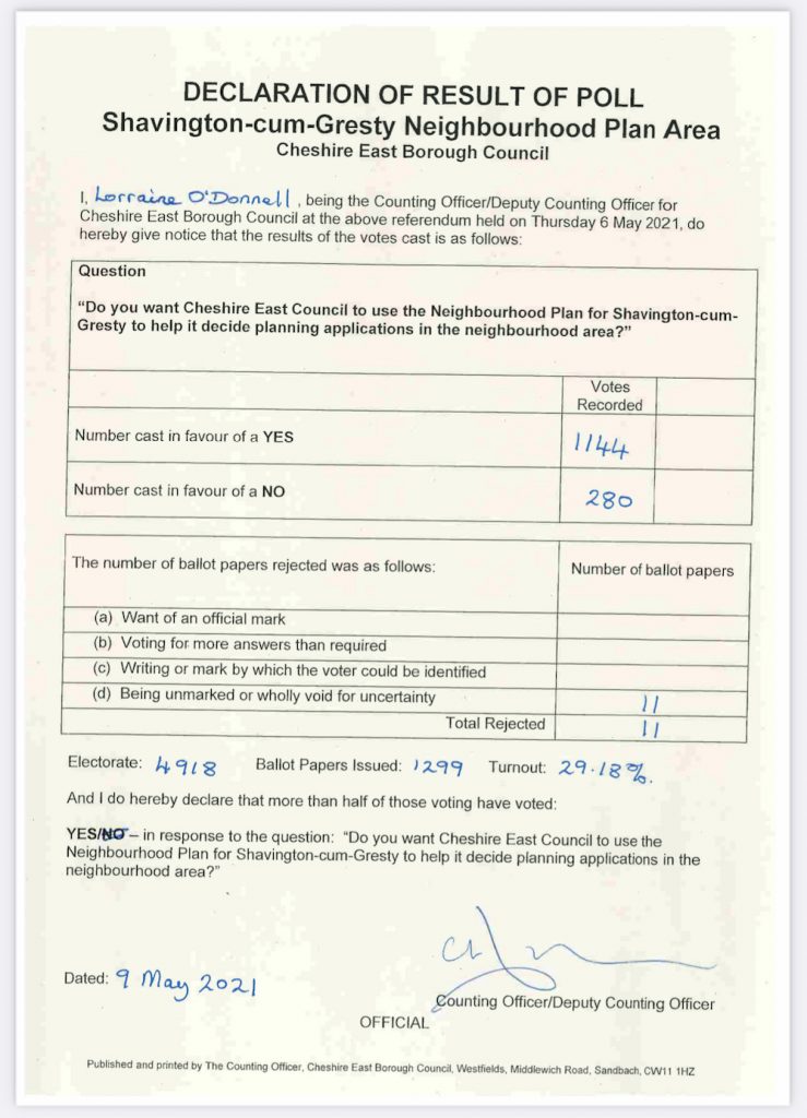 Over a third of the electorate turned out to vote in Alderley Edge, a high level for such a referendum, and almost 91% of those who voted were in favour of the plan.