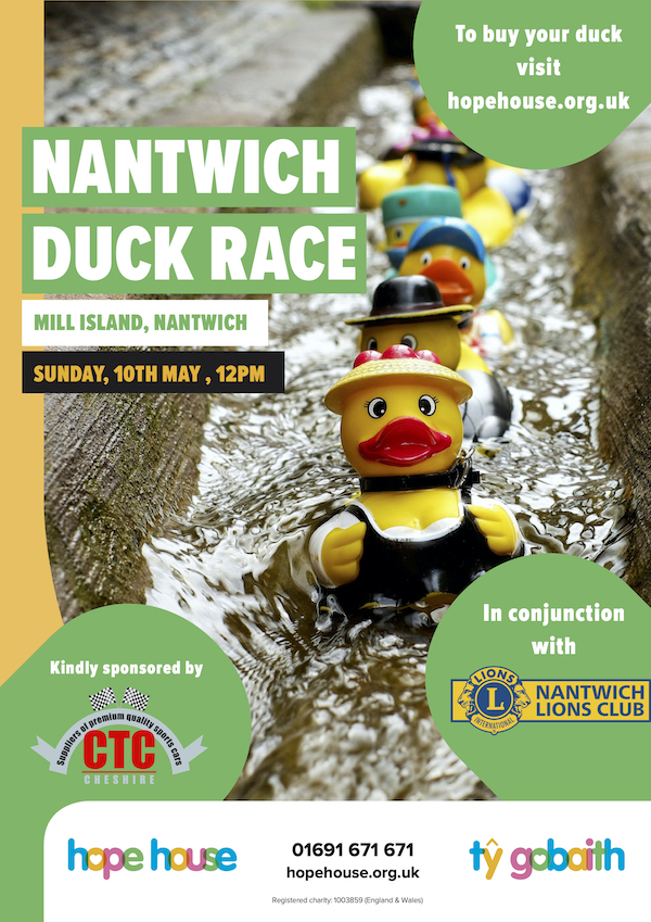 The first ever Nantwich Duck Race – last year – made just over £1,800 for Hope House and hopefully this year’s event will be even bigger with the help of the local people of Nantwich.