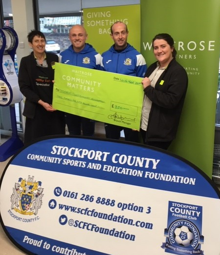 Stockport County Community Foundation was one of good causes represented throughout October, and was recently given a cheque for £350 by the upmarket supermarket.