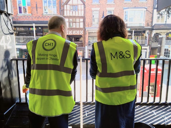 It may look a bit like the ‘Gilets Jaunes’ have taken over Chester, but be assured that the yellow hi-viz jackets are in fact those of a team led by CH1ChesterBID.