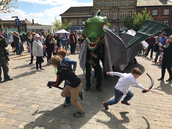 Picture (above): the fearsome dragon from St George’s Day 2017 event, created by Macclesfield Community Artspace