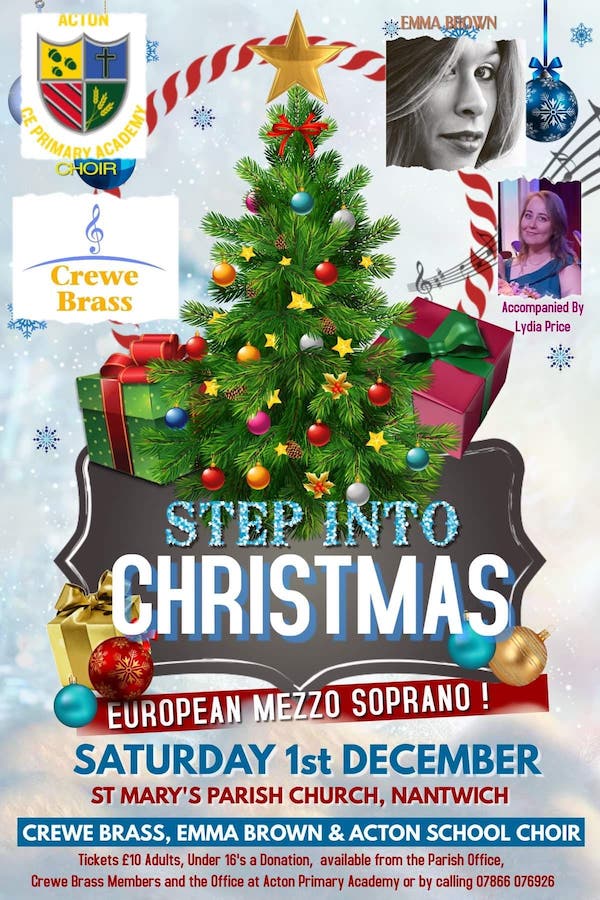 The concert will feature Crewe Brass, European mezzo soprano Emma Brown, and Acton CE Primary Academy Choir, accompanied by Lydia Price on piano.