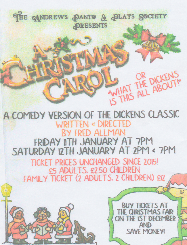 The Andrews Panto & Plays Society (TAPPS) are performing ‘A Christmas Carol’ (comedy version) at St Andrew’s Church Hall on Bedford Street in Crewe.