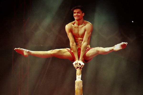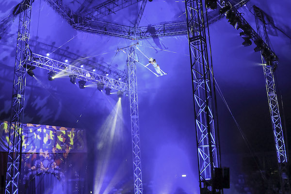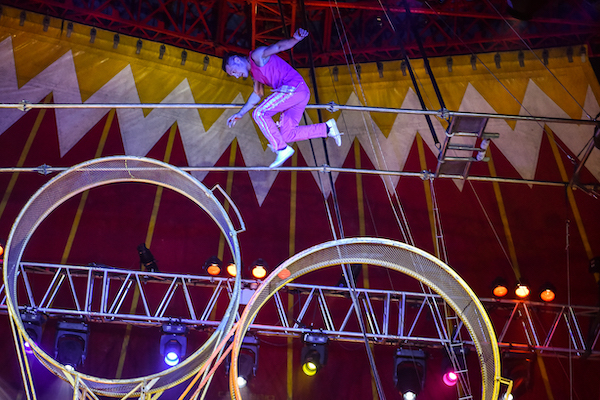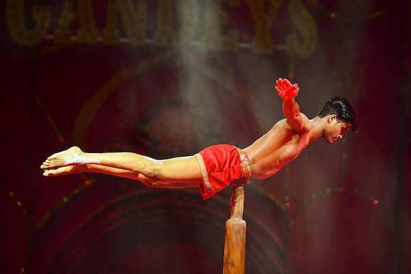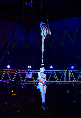 Our Latino ensemble of Cuba twist, swing, somersault and catch each other at high speed without the aid of a safety net – before suspending themselves from the big top roof, hanging by just their hair.