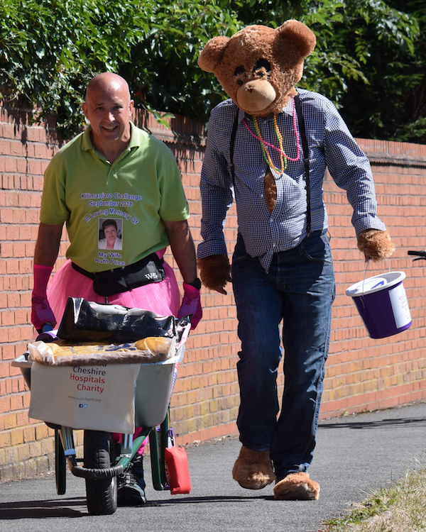 Charity fundraising friends Roy Price and Ian Jones, from Crewe, have thus far this year raised over £2,700 by pushing a 100kg wheelbarrow and wearing a bear costume respectively on a fourteen mile walk from Crewe to Nantwich and back.